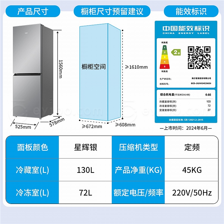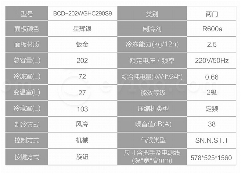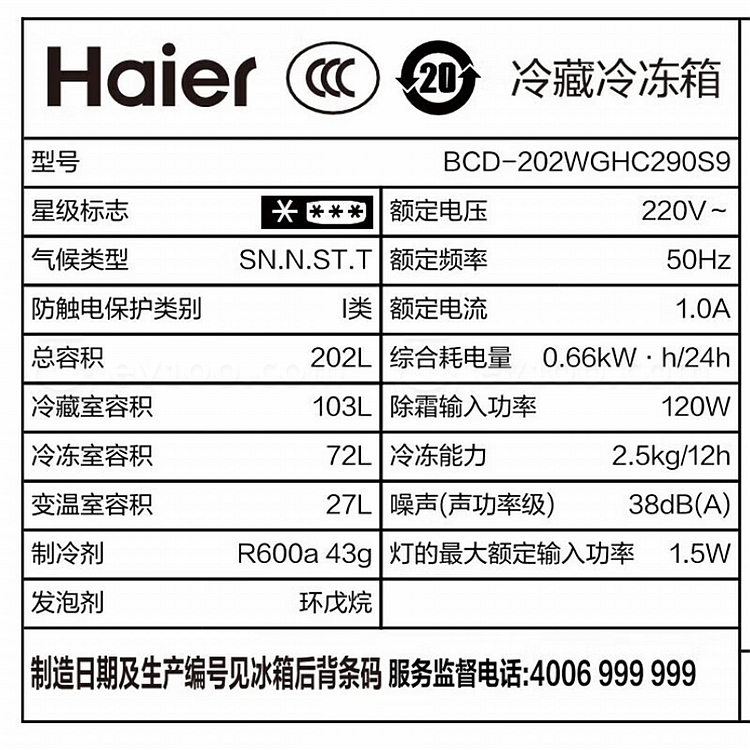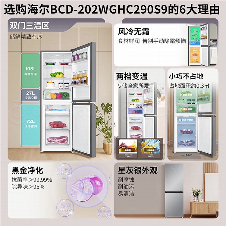 海尔 双门风冷冰箱 202升 BCD-202WGHC290S9