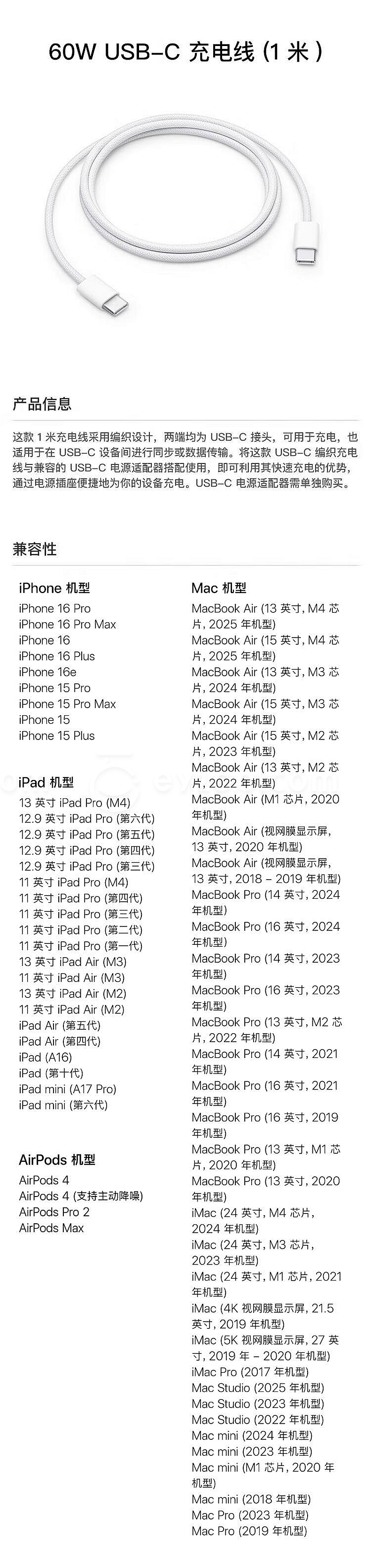 苹果 Apple 60W 双USB-C编织充电线 1米 MW493FE/A