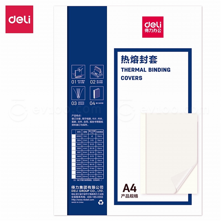 得力 热熔封套 10PCS/包 (白) A4 8mm 3869