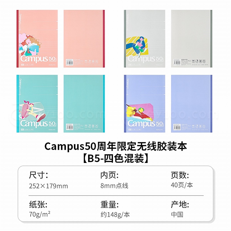 国誉 50周年限定无线装订本套装 (4色混装) B5/40页 8mm点线 4本/封 WSG-NB9MB54E1