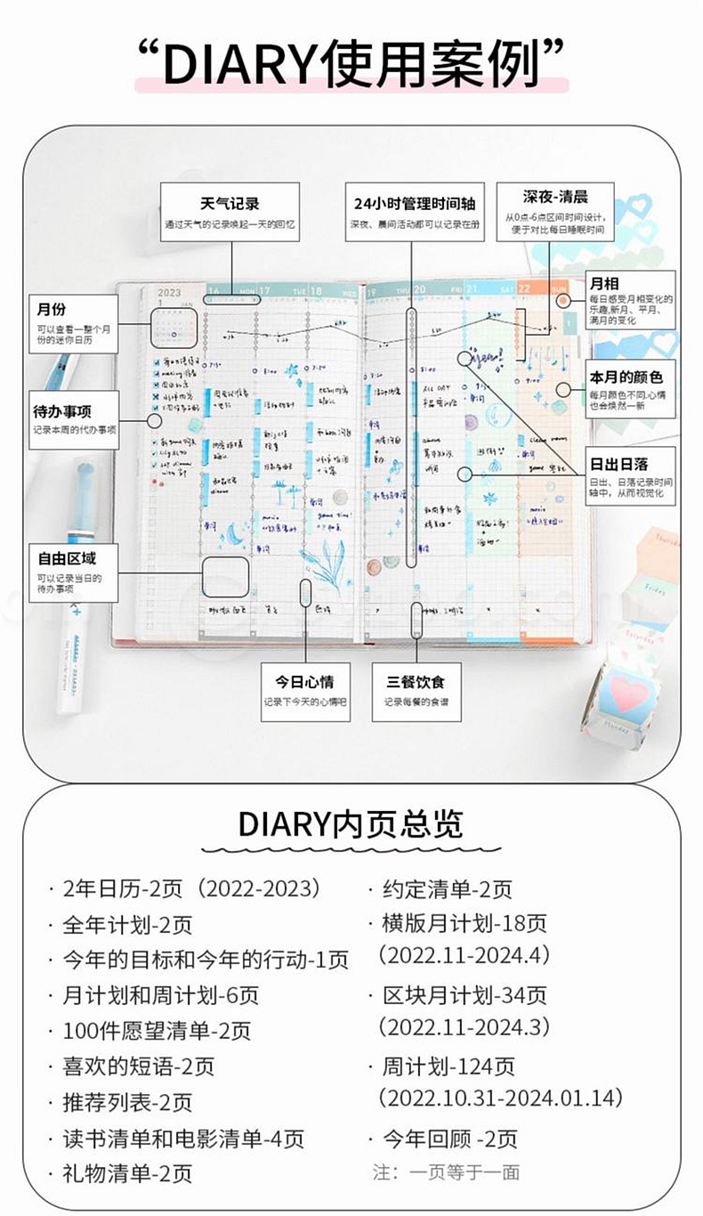 DIARY:含2022年、2023年日历;可以制定年计划(2023年1月-2023年12月);月计划(2022年11月-2024年3月);周计划(2022年11月-2024年1月第二周