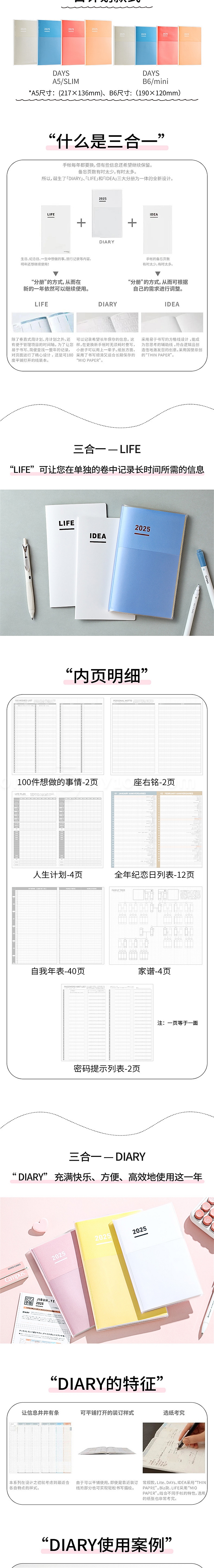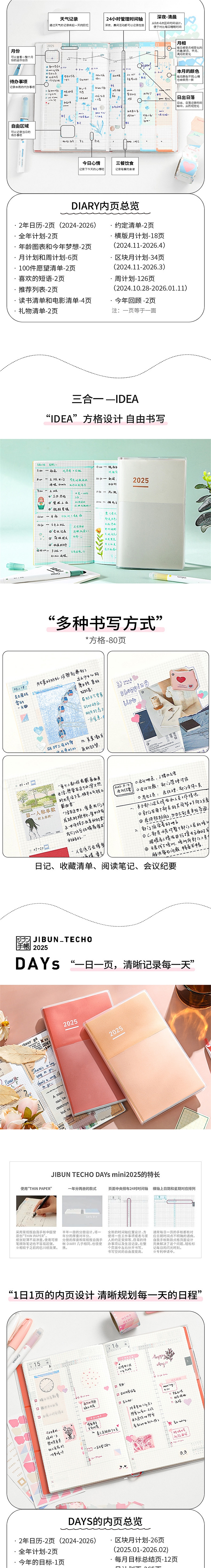 DIARY:含2024年、2025年日历;可以制定年计划(2025年1月-2025年12月);月计划(2024年11月-2026年3月);周计划(2024年11月-2026年1月第二周)