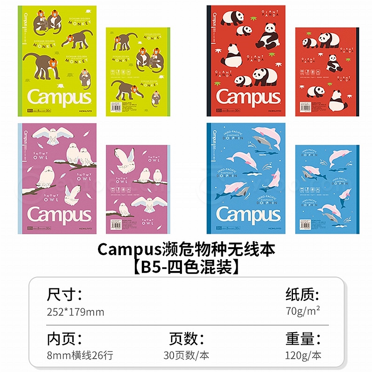 国誉 Campus无线装订本套装(濒危物种) (4色混装) B5/30页 8mm点线 4本/封 WCN-CNB1374-5