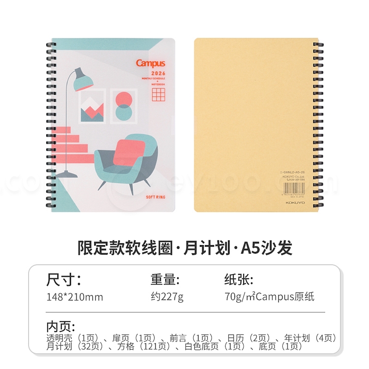 国誉 2026年Campus PP面软线圈手帐日程本 (沙发) 月计划(限定款) A5/80页 NI-SMNL2-A5-26