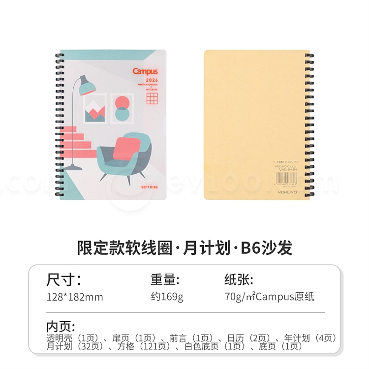 国誉 2026年Campus PP面软线圈手帐日程本 (沙发) 月计划(限定款) B6/80页 NI-SMNL2-B6-26