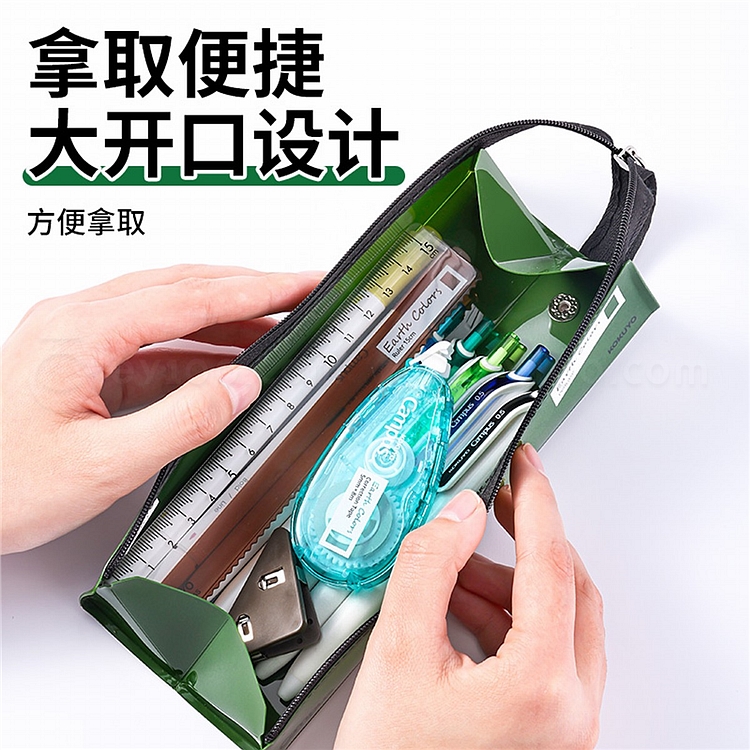 笔袋打开状态下,拥有宽敞的收纳空间,便于拿取文具,收起后外形变小,便于携带