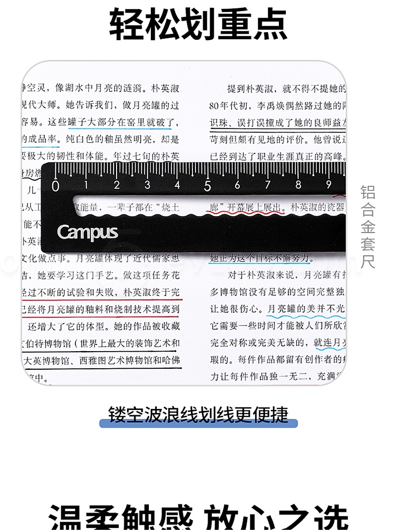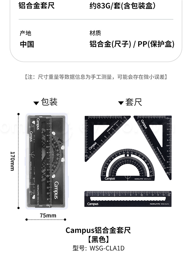 国誉 Campus铝合金套尺(直尺+三角尺+量角器) (黑色