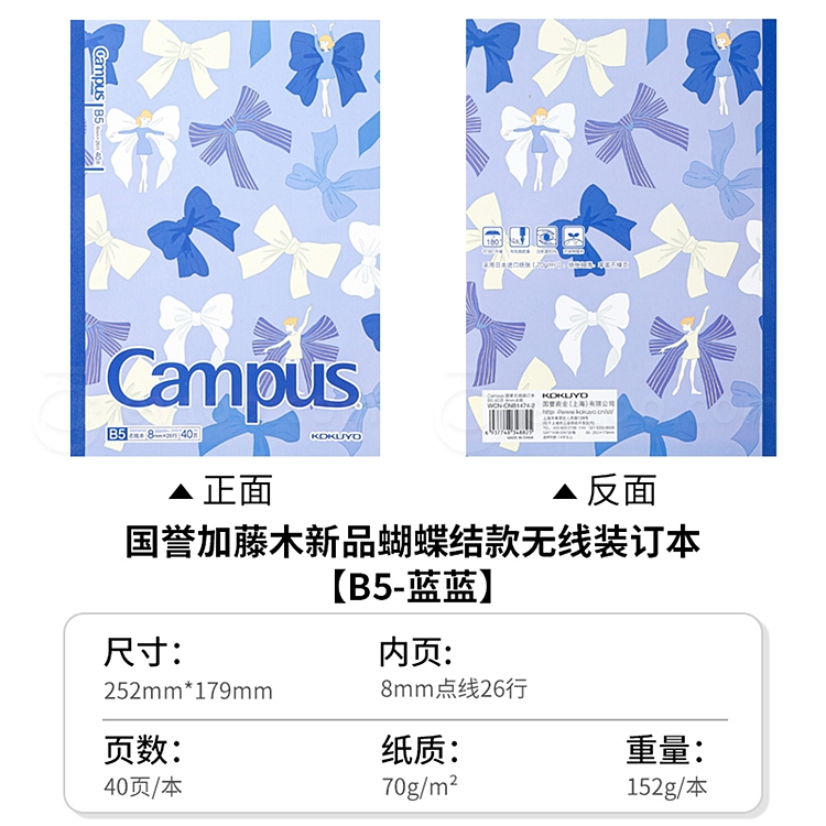 国誉 Campus无线装订本(加藤木) (蓝蓝) B5/40页 8mm点线 WCN-CNB1474-2