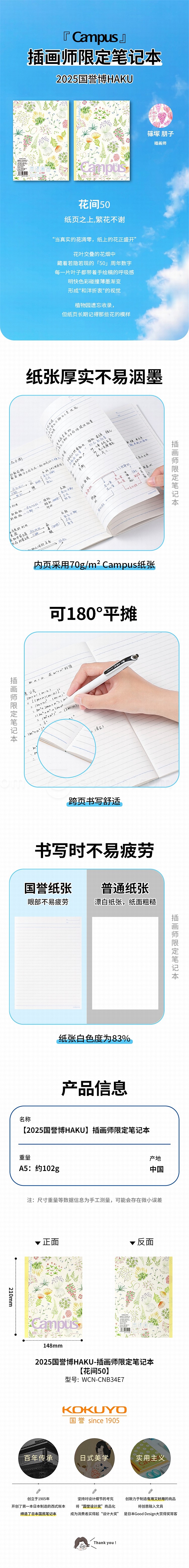 国誉 2025年HAKU插画师限定 无线装订本 (花间50) A5/40页 8mm点线 WCN-CNB34E7